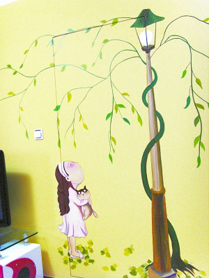 目前人們比較喜歡家庭中的繪畫(huà)藝術(shù),各種噴繪、手繪的圖案在家居中盛行。而繪畫(huà)也常常被應(yīng)用在隱形門上,讓畫(huà)面掩蓋門。這個(gè)案例就是把墻和門做成一個(gè)整體,然后在整面墻上進(jìn)行繪畫(huà),用畫(huà)的圖案把門隱藏在墻上,它的巧妙之處是利用畫(huà)中高高的燈柱,深色燈柱高而直,把門的一邊縫隙藏了起來(lái),不細(xì)看就看不出門在哪里。