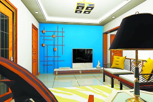 在客廳中,兩個(gè)臥室門和衛(wèi)生間的門對(duì)著客廳,從視覺(jué)上感覺(jué)比較凌亂。而衛(wèi)生間的門正在電視背景墻面上,有了門,這面背景墻顯得長(zhǎng)度不夠,也不規(guī)整,同時(shí)坐著看電視時(shí)正對(duì)著衛(wèi)生間的門,從心理和衛(wèi)生角度來(lái)講,都不合理。所以把衛(wèi)生間的門做成了隱形門。主要是把整個(gè)墻面做成一個(gè)造型,根據(jù)客廳的整體風(fēng)格,用深藍(lán)色作為背景色,形成客廳的一個(gè)主題墻面。同時(shí),利用簡(jiǎn)單的線條和木質(zhì)裝飾,做成了隱形門。