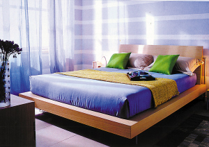 藍(lán)色床品、藍(lán)色窗簾和藍(lán)白相間的墻面,讓人聯(lián)想到“揚(yáng)帆遠(yuǎn)航”時(shí)那涼風(fēng)撲面的感覺。床頭柜和床具選擇原木材質(zhì),傳達(dá)出涼爽親切的特質(zhì)。地毯、靠枕只選擇冷色和單色的款式。別忘了在臥室中點(diǎn)綴素雅花朵,為一片蔚藍(lán)加入雅致和馨香。