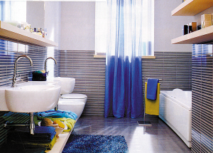 在長方形的灰白浴室里,面盆和坐便器安排在同一側(cè),另一側(cè)用來安放浴缸,清晰的空間規(guī)劃讓人一目了然。分別在面盆下和一人高的墻面位置,安裝用來收納衛(wèi)浴雜物的擱板。藍(lán)色的窗簾,讓空間滲入了海洋的涼爽氛圍。橙色、綠色的毛巾與藍(lán)色毛巾搭配,降低過分素凈的感覺。