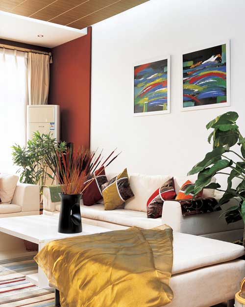走進(jìn)客廳是一組米白色的沙發(fā),潔白的茶幾,米白的窗簾,豆綠色的很民族風(fēng)味的靠墊,與灰色暗紅調(diào)子的條紋地毯搭配,是鄉(xiāng)村風(fēng)格的淳樸標(biāo)簽。女主人說客廳整體的素色,意味著她可以在未來(lái)添置新的裝飾品,而不用擔(dān)心顏色搭配問題。不管是墻角碧綠嬌艷的大盆綠植,還是茶幾上一大束色彩鮮艷的裝飾花,在這個(gè)極素的調(diào)子上,都散發(fā)著柔美與溫馨的自然感覺。