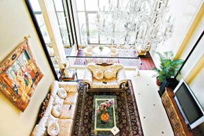 這幢545平方米的豪宅客廳有兩層高、超寬設計,空間闊綽舒適,以高度詮釋家庭的氣勢,突顯大家奢華。