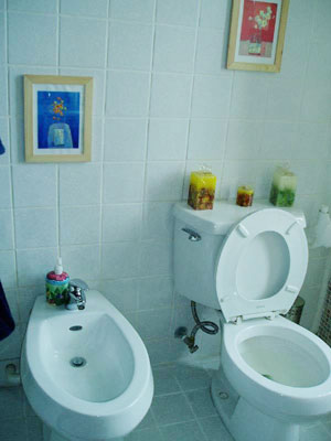 抽水馬桶的沖水槽上方是用廁時(shí)達(dá)不到的地方,我們可以利用此空間做一吊柜,深度約15厘米,才不致給人造成不便。柜內(nèi)可放置衛(wèi)生紙、手巾、洗潔劑、女性衛(wèi)生用品等,也可在下部做成開(kāi)放式,放些綠色植物裝飾。