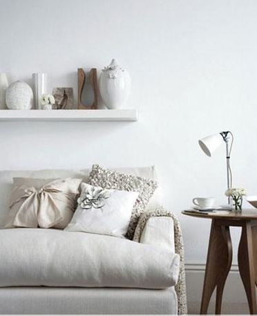 純白色墻漆奠定室內(nèi)主色調(diào),純白沙發(fā)上隨意堆砌數(shù)個(gè)白色布藝靠墊,或編織而成、或以雛菊、蝴蝶結(jié)等裝飾,美觀大方。純木小桌給白色世界加上了難得的一筆自然色。臺(tái)燈、咖啡杯、水杯、碗、花等一律白色。沙發(fā)背后墻面架子上,瓷花花瓶、木質(zhì)花瓶、折疊花瓶等將空間裝點(diǎn)得越發(fā)生動(dòng)。
