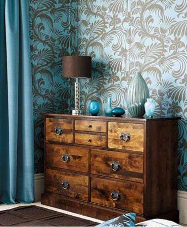 在這里,古樸與張揚(yáng)和諧共存,泛黃的銅環(huán)抽屜與藍(lán)底黑紋墻紙并不突兀。新與舊的家具、墻紙、飾物互相映襯,相得益彰。