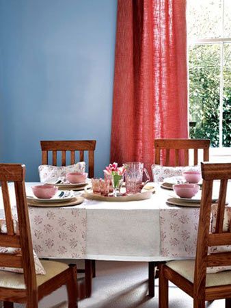 素色的回歸最能代表居家情緒的溫度,那是返璞歸真的淡定和從容。淡藍(lán)灰色墻面搭配大幅淺紅色窗簾,然后用覆盆子紅、柔和粉紅色調(diào)的布藝及配飾營造出一種別樣的溫馨與雅致。