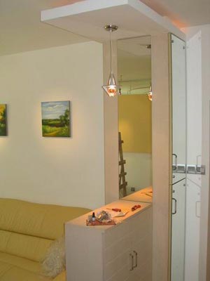 為了不讓來客一眼就看到客廳,屋主一直希望入門處能作玄關隔屏??剂康綄嵱眉邦A算,設計師建議用鞋柜代替。雖然鞋柜的價格比玄關隔屏來得貴,但卻比較實用,最重要也省了玄關隔屏的費用。