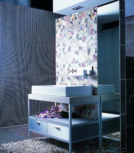 如果你的墻面底色較深就運(yùn)用博洛尼最大膽的POP花色瓷磚作為主題墻裝飾墻面吧。讓報(bào)紙堆砌出的亮麗色彩大面積裝飾,拼貼的效果會(huì)使浴室設(shè)計(jì)看起來(lái)更加大氣,配上熠熠生輝拉絲鋁浴室家具和亮面鏡子絕對(duì)拉風(fēng)。張揚(yáng)的創(chuàng)意是時(shí)尚年輕人不二的選擇。