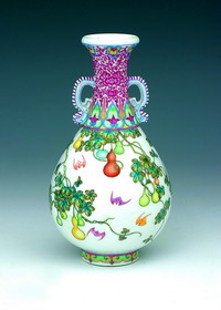 還有有彩瓷皇后之稱的琺瑯彩,曾經(jīng)是皇宮里制成的極為名貴的宮廷御用瓷器,品種少、產(chǎn)量少、質(zhì)地精,傳世品均秘藏宮苑,一般人難于見到。這種創(chuàng)燒于康熙時期的彩瓷,其工藝一度是個謎,記得著名收藏家馬未都先生曾經(jīng)說過:“瓷胎畫琺瑯彩,在1925年故宮成立以前,就沒人看見過,所以老百姓覺得它特神秘”。因此,近年來只要琺瑯彩瓷器在拍賣會上一露面,必遭到有實力買家的窮追不舍。去年,一件清乾隆御制的琺瑯彩“古月軒”題詩花石錦雞圖雙耳瓶拍出了一個多億。因此,高仿琺瑯彩瓷器也不是件容易的事,能夠見到燒制完美的高仿琺瑯彩瓷器也是一種榮幸。