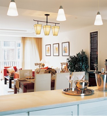 在廚房里設置一個吧臺,是這是品位人士追求生活質(zhì)量的寫照。試想,在一個開放式的廚房里,細心的主人只將具有分割功能的餐桌稍加點綴,就把它變成一個簡單而漂亮的小吧臺。餐桌的上方設計一道弧形的窗口,在配上精致小巧的罩燈,餐桌上再擺放些有情趣的藝術品,色彩上再強調(diào)一些現(xiàn)代感元素……