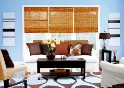 蘋果綠沁人心脾,適合做居室色調,在一只木盒子里種些芽草擺在咖啡桌上,有親近自然的感覺。在白色羅馬簾上系上與靠包圖案一致的裝飾帶,形成呼應。沙發(fā)兩旁擺著的花筒由電鍍金屬制成,刷成綠色擺上去就可以了。