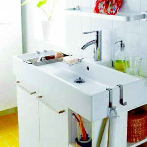 將面盆下方的空間安放儲(chǔ)物柜,面盆上部貼墻的位置釘上10厘米寬的擱板,可以放化妝瓶、刷子、洗漱杯等。擱板高度以不妨礙使用水龍頭為宜,材料可選用木板、玻璃等。