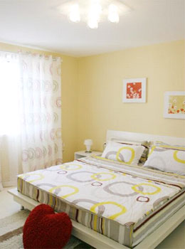 你也可以運用一些小技巧,把你的臥室布置的與眾不同。如在屋頂裝上長型的白熾燈,在燈的下方兜上一層白色輕質(zhì)透明的幔布,使強烈的燈光變得柔和,使房間看起來充滿情調(diào)。你也可以在床下裝上一盞藍色的燈,讓進入房間的人只看得到燈光而看不到燈泡,使你的床看上去象漂浮在水上一樣,這種設(shè)計會讓每個進過你房間的人感到你的別具匠心。