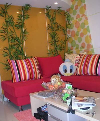 房子是女主人自己設計,朋友幫忙裝修了,總造價是5萬元,裝成這樣的效果,絕對是超值。我的家是標準的單室廳,由于房間凈高有四米八,所以廚房及衛(wèi)生間上隔出了一間臥室,一進門就可以看見客廳及衛(wèi)生間的墻體,所以種上了竹子增加一抹綠意同時也擋住了廁所的墻,橙色夾金絲的烤漆玻璃為客廳增加了一些暖意,意思沙發(fā)選用大紅色,也是增加了一種活潑的氣氛 。