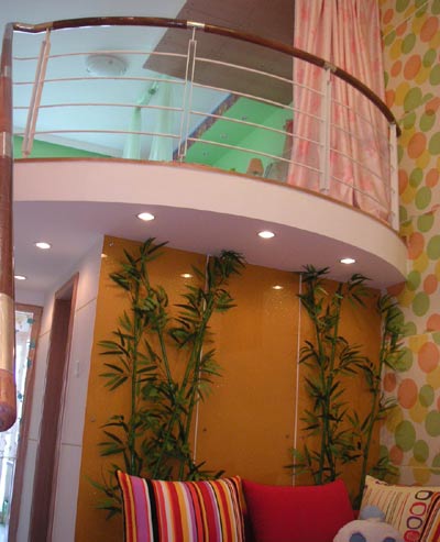 我的家是標準的單室廳,由于房間凈高有四米八,所以廚房及衛(wèi)生間上隔出了一間臥室,一進門就可以看見樓上的臥室,所以采用一面落地簾把臥室和客廳分隔開,粉紅色的簾子和臥室地面的粉紅地毯相呼應,覺得很是柔和溫暖可愛,標準的紅粉女孩的閨房,墻紙也是特地選的彩色的增加一些卡通氣息,背后的翠綠色墻是女主人的最愛,為營造臥室輕松的氛圍起到很好的作用。