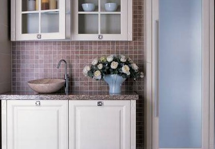 將往昔的魅力與現(xiàn)代生活結(jié)合在一起,永遠是設(shè)計師創(chuàng)新的源泉。浴室家具門板上的刀切紋路,小巧古典的柜門把手,這些細節(jié)跟過去在舊電影中看到的一樣,呈現(xiàn)著一股凝固住時間的懷舊氣息。只有注重整體細節(jié),才會有完美無暇的整體效果。整面主題墻,無論色調(diào)、造型與飾物的擺放,都顯得輕松而舒適,每日一小時的衛(wèi)浴時光成為鄉(xiāng)野中的小憩,帶著懶洋洋的悠閑氣質(zhì)。