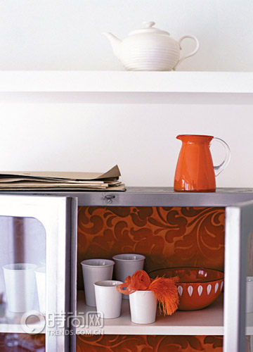 用鮮亮圖案的材質(zhì)或墻紙來(lái)重新裝飾櫥柜,這是一個(gè)簡(jiǎn)單易行的制造沖擊力的方法。用當(dāng)代風(fēng)格的墻紙、壁布,甚至是印刷品都可以,將它們貼在櫥柜里面、柜門(mén)上或者干脆就貼在外面。但最好和整個(gè)空間的風(fēng)格和色調(diào)相協(xié)調(diào)。