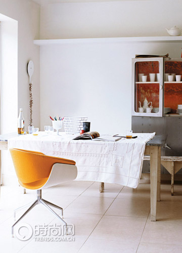一把極具風(fēng)格的橙色椅子和橙色材質(zhì)的櫥柜使實(shí)用的廚房凸顯性格。精致的亞麻提花的舊桌布既遮蓋了有些磨損的桌面又給廚房帶來(lái)些許暖和雅致的氣質(zhì)?,F(xiàn)在廚房在不做飯時(shí),也可以被用來(lái)看書(shū)或者思考了。