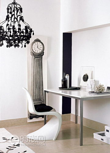 用混搭的風(fēng)格來(lái)更新經(jīng)典的黑白搭配。一條簡(jiǎn)單的黑色長(zhǎng)條色塊增加了角落的深度,本來(lái)輕易被忽視的角落反而成為了居室里的亮點(diǎn)。其它配飾的選擇除了顏色非黑即白之外,最好選擇不同的材質(zhì)和質(zhì)地,這樣就會(huì)有既豐富又單純的效果。