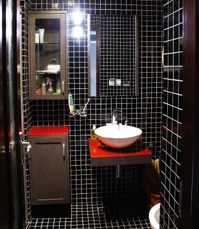 因此,設(shè)計(jì)裝修這一款衛(wèi)浴室的時(shí)候,正是緊緊圍繞這一主題展開的。除了合理布局浴缸、坐便器與盥洗盆,減少洗浴、洗衣和化妝洗臉的相互干擾等因素外,在色彩上也有一定的個(gè)性。黑色的亮光玻璃馬賽克,中間點(diǎn)綴一點(diǎn)紅色,這樣形成既深刻又強(qiáng)烈的視覺感。同時(shí)使用大片的吊頂鏡面來增加空間感,衛(wèi)浴中間是一個(gè)特別大的白色浴缸。白色浴缸與黑色墻面和地板,形成黑白分明的反差,再加上紅色馬賽克的點(diǎn)綴,增加了幾分魅惑和迷離。
