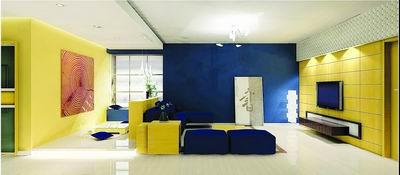 因為房間的面積本身很小,假如做出一個硬隔斷的話就顯得空間很局促,所以我們首先在地板上,選同種材質(zhì)和顏色的木地板,從地面上看兩者比較協(xié)調(diào),視覺效果比較統(tǒng)一。而在房間的顏色上,選擇黃和藍兩種互補的顏色,既對立又統(tǒng)一??蛷d的兩面墻用大面積的藍色和黃色,對比非常鮮明,在家具上,又用藍色沙發(fā)和黃色的茶幾、角柜交叉點綴??蛷d茶幾下用淺色地毯,既不和木地板沖突,又能劃分出客廳的主要范圍。休閑區(qū)域主要以黃色為主,和客廳的電視墻顏色互相呼應(yīng),達到最大程度的統(tǒng)一,地臺上只用了兩個藍色靠墊作為點綴,起到畫龍點睛的作用。