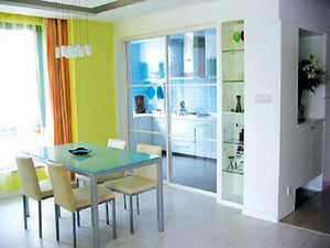 除了一些搞藝術(shù)的專業(yè)人士敢于在自己的家里大玩色彩游戲,絕大多數(shù)普通家庭都更傾向于采用簡(jiǎn)潔的風(fēng)格,究竟這樣的單色調(diào)不輕易讓人心生厭倦感。而這一次我卻看見(jiàn)好幾個(gè)完全不相干的顏色,在不同的房間里發(fā)揮著不同的視覺(jué)作用。右手邊的飯廳,墻面為淺淺的草綠色,搭配黃色條紋窗簾;而透過(guò)時(shí)下忽然變得很時(shí)髦的玻璃移門,可以看見(jiàn)廚房里的墻壁上貼著淡藍(lán)色的瓷磚,都是冷色系的,但由于顏色調(diào)得很粉,所以顯得非常年輕。