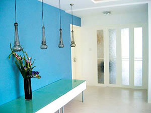 這套居室給人的最大感覺(jué)是淡雅之美。進(jìn)門玄關(guān)處做了一個(gè)凹面,也擺放著花瓶,有射燈對(duì)著照,光線柔和,將人家的目光引至地面,那里有一個(gè)很小的長(zhǎng)方形玻璃“盒子”,里面盛著些小石子,女人的巧心思在這里得到充分的體現(xiàn)。