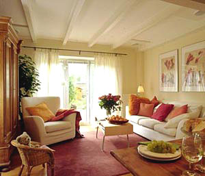 設計師在這個客廳的設計上,刻意追求音樂中的韻律。櫻桃木的實木地板和淺黃色的內(nèi)墻乳膠漆顯得沉穩(wěn)、大度,是整個客廳的“基調(diào)”;而通向陽臺的“啞口”上方的裝飾以及天花板上的假梁和燈具,則是“客廳樂章”的“華彩樂段”??蛷d入口的裝飾性書架和陽臺旁的展示架,則是整個樂章的開頭和結(jié)尾。