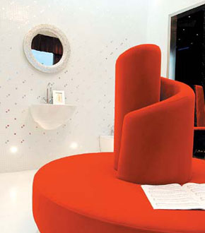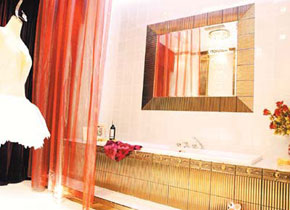 頭上是璀璨的斯華洛世奇水晶吊燈,腳邊環(huán)繞著范思哲的粉色瓷磚,眼前是造型纖巧圓潤的唯寶潔具,舉手可以把玩福捷克產的鎦金玻璃花瓶;而變色龍式的酒紅落地幔紗,紅黃綠白紫七彩交錯,螺旋形水晶燈更將簡單的浪漫單符彈奏成一首立體的幻想曲。這便是名家建材賣場里羅曼蒂克衛(wèi)浴套件營造的奢華浪漫空間和氛圍。走進這浪漫的氛圍,讓人不禁聯(lián)想起白居易的詩:“春寒賜浴華清池,溫泉水滑洗凝脂”。