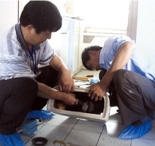 (3)在印記處打直徑20毫米、深60毫米的孔洞,把直徑10毫米螺栓插入洞內(nèi),用水泥捻牢,將座便器眼對準(zhǔn)螺栓放好,使之與印記吻合,試驗后將座便器移開。在座便器出水口及下水管口周圍抹上油灰,再把座便器的四個螺栓孔對準(zhǔn)螺栓,放平找正,螺栓上套好膠皮墊,擰上螺母,擰至松緊適度。