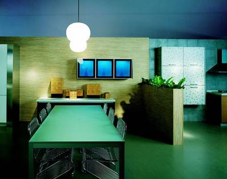 輕松舒爽、心曠神怡的色彩。綠色是永遠用不完,永遠不會讓人感到厭煩的主題,因為它的每一點變化,都對應著自然給人類的印象,所以綠色適合所有喜歡它的人。從淡綠轉化為灰綠,然后暗紫,完成室外到室內的過渡,對應了人的視覺對空間的自然反應。淡綠如田野的地板,黃色如秋葉的柜體,墨綠如松針的臺面,構成一幅自然景色,使人心情豁然開朗。淡綠與淡藍的配合,則使廚房布滿盎然生氣。生活在淡綠的空間里,夢都是清新的。明快而錯落的綠,讓人仿佛來到青山翠谷。