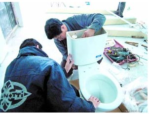 3、在印記處打直徑20毫米、深60毫米的孔洞,把直徑10毫米螺栓插入洞內(nèi),用水泥捻牢,將座便器眼對(duì)準(zhǔn)螺栓放好,使之與印記吻合,試驗(yàn)后將座便器移開。在座便器出水口及下水管口周圍抹上油灰,再把座便器的四個(gè)螺栓孔對(duì)準(zhǔn)螺栓,放平找正,螺栓上套好膠皮墊,擰上螺母,擰至松緊適度。