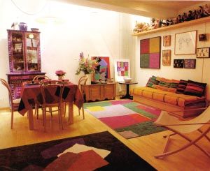 在淡紫與鵝黃色彩柔和的平面上,一個多彩的燈飾,幾乎是抽象派藝術(shù)的翻版,不規(guī)則的外形以及三原色在此都可以看到。從花瓶與插花中,橘色與紫色的平衡,到椅子流暢的線條,每一細(xì)節(jié)無不精心設(shè)計,從而達(dá)到整體的完美。