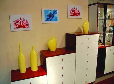 餐具配飾的選擇在白色家具的襯托下,粉紫色是非常迷人的色彩,能給人浪漫、溫馨的感覺,用來營造餐廳氣氛非常合適。餐桌上的配飾和餐具可以選擇比白色、粉紫色更明艷一些的玫紅色,以便更有對比層次。餐柜旁的鮮花架,增添了餐廳的浪漫柔和氣氛。