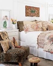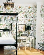 樹林之聲 紛繁富麗的墻布令人感覺仿佛走進野花遍地的樹林,林中蕭蕭的樹葉聲中傳來清幽的鳥鳴,黑胡桃木的床好象就擺在樹林中,白色的床罩和黑白條紋的靠枕簡潔而理性,與漂亮的墻布形成鮮明而生動的對比。