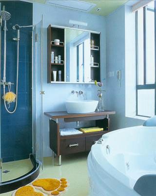 浴室具體設(shè)計(jì): 色調(diào)任意的色調(diào)。只要處理好色澤的干凈問(wèn)題就行了。我建議你用淺深色配搭。這樣效果最好。經(jīng)過(guò)長(zhǎng)期的實(shí)踐,我熟悉在家庭裝修中用黑色、深綠色、深藍(lán)色比較輕易感到臟,所以一定要配合白色使用。