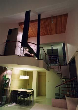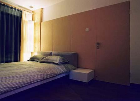 這是個頂層復(fù)式,帶斜屋頂?shù)淖≌蔽蓓攺目蛷d的南面一直到最頂端。這種戶型在設(shè)計(jì)上有些難度,卻又布滿挑戰(zhàn)。設(shè)計(jì)師郭繼沒有采用普通的吊頂取平做法,而是讓斜屋頂保持原有的建筑結(jié)構(gòu),利用兩個自制的倒U形燈具懸掛著,U字形燈底端與屋內(nèi)地面平行,兩個U字形起到了隱性的作用,讓視覺上不再受限斜屋頂而是具有均衡的感覺。整個房間的色彩是以淺色為主,在適當(dāng)?shù)奈恢茫礃翘萑肟谔庍\(yùn)用了一些暗色調(diào)的透氣性強(qiáng)的玻璃材質(zhì)(玻璃噴黑)讓空間視覺加強(qiáng)對比,起到一個很好的效果。有時候,看似簡單的設(shè)計(jì)就能創(chuàng)意無窮。