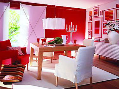 餐廳看起來好漂亮,精致的漂亮。餐廳以紅色和白色為主,看起來色彩分明,視覺效果很不錯。餐廳沒有采用普通的窗簾,而采用了日式風(fēng)格的窗簾,特別又漂亮。白色吊燈裝的也很有特色遠(yuǎn)遠(yuǎn)看起來像是朵很大的花,別致。白色的地毯與頂墻正好相呼應(yīng),這樣就不會有“頭重腳輕”的感覺了。白色的墻壁上掛滿了大小不一的畫,大多數(shù)還是以紅色為主整體搭配的巧妙。