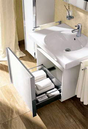 充分利用洗臉池下面的空間??梢栽谄渲性O(shè)計一個儲物柜,放入毛巾、牙刷、牙膏、及各式洗浴洗頭用品,也可以用來儲存衛(wèi)生紙和衛(wèi)生巾。