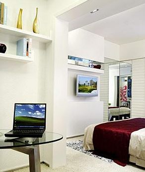 通過(guò)走廊過(guò)道明確區(qū)分了臥室的空間,開放中保留著隱蔽。蝕花玻璃引發(fā)光與影的對(duì)話,約隱約現(xiàn),欲拒還迎,香艷魅力勢(shì)不可擋,如同女性風(fēng)姿掩映,現(xiàn)在高級(jí)女白領(lǐng)外表矜持而內(nèi)心狂熱的表達(dá),讓人遐想無(wú)限??蛷d里掛上紫紅玻璃紗,如成片成片的花瓣隨風(fēng)飄落。醒目的圓角沙發(fā),時(shí)尚大方,打破傳統(tǒng)的束縛。地毯與天花的呼應(yīng),似是輕描淡寫的燈光和擺設(shè),把整個(gè)空間層次列得分明有序,而且處處凸顯了香艷時(shí)尚的性情。