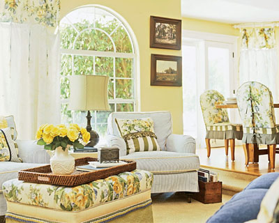色調一致的花草圖案出現在靠墊、椅套和簾頭的布藝上,讓原本略顯厚重的家具充滿清新的活力;用同色系的條紋、格紋布藝拼接搭配,化解花草圖案帶來的繁亂感。同時,淡奶黃色的墻面、白色的木格門窗能對花草圖案起到協調的襯托作用,讓圖案與房間相稱。