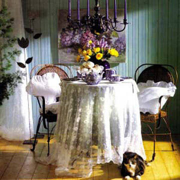 餐廳和居室用蕾絲裝飾后,看起來明快活潑,還很漂亮。窗簾如果遇到蕾絲,就會(huì)擁有變身的能量,當(dāng)日光掠過,花邊會(huì)形成跳躍的影子穿過房間。漂亮的蕾絲花邊,還可以裝飾窗簾掛鉤,此外,它也可以用來保護(hù)光滑的木制表面。