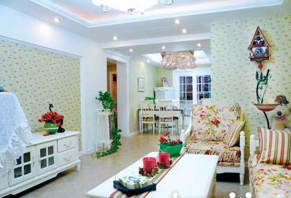 客廳的沙發(fā)是時下很流行的布藝與實木結合的款式,大花朵布藝與白色外框搭配很大氣。電視柜、鞋柜、茶幾、餐桌椅,每一件家具都是白色的,用花瓶、桌旗等飾品進行點綴,顯得既整潔又不呆板。