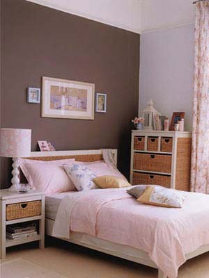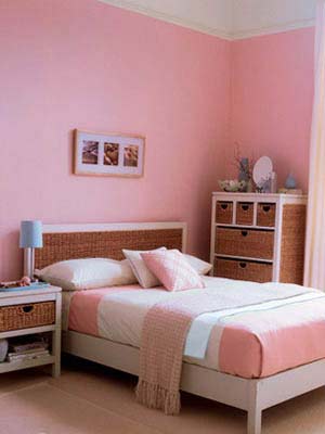 粉紅色的墻面定下整體基調(diào),給人以朦朧的浪漫感覺(jué)。灰白色羊毛地毯,以及白色窗簾與粉紅色過(guò)度十分自然。白色的床邊小桌和柜子仍然帶藤制抽屜,桌上放有藍(lán)色托盤(pán)和藍(lán)色臺(tái)燈,是整體色調(diào)中活潑的一筆,柜子上飾以小圓鏡、藍(lán)色花瓶和小花枝?;野咨拇采细惨苑奂t色的床罩,白色床單、白色枕頭、藍(lán)、粉色小靠墊,溫暖而舒適。