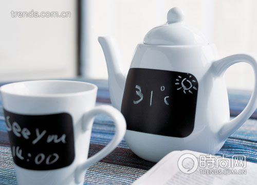 茶具雖然只有簡單的黑白兩色,但跟其他掛著單一數(shù)字標(biāo)牌的物件相比,顯然更充滿樂趣。手寫體數(shù)字和文字無不充滿了童趣與稚拙。