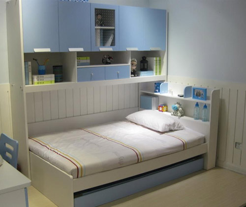 針對(duì)有些家庭已經(jīng)給孩子買了單層的兒童床,家長(zhǎng)可以向孩子的床上和床下要空間,即床下可以做儲(chǔ)物的抽屜,床上的墻壁可以做上吊柜用來充當(dāng)書柜。