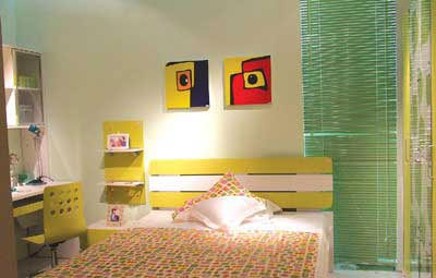 墻的正中兩幅后現(xiàn)代主義的畫讓人一進(jìn)入房間就感覺被浪漫的氣氛所包圍,宛如置身于二十世紀(jì)三十年代抽象派畫中的那種奇幻的風(fēng)格之中。但是簡單的色彩,只有紅、黃、黑三種顏色混合和無序的組合,又處處給人感覺到現(xiàn)代生活的氣息。