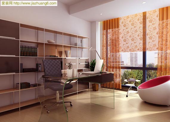 書房的色彩力求穩(wěn)重、優(yōu)雅,設(shè)計(jì)時(shí)最好能與使用者的性格、年齡一并考慮,使整體色調(diào)寧靜而舒爽。窗簾的配置亦很重要,一般以選用既能遮光,又有通透感覺的淺色紗簾比較合適。強(qiáng)烈的日照通過窗幔折射變得溫婉、柔和,使眼睛免受光線的直接刺激。