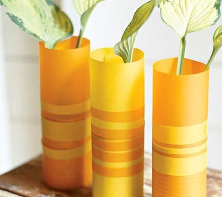 漂亮的紙花瓶一樣可以盛放鮮花。用牛皮紙把空罐頭瓶卷起來,粘好,再用彩色的紙條點綴。