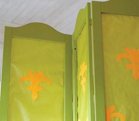 用紙就可以將舊屏風修補得煥然一新。把舊屏風面拆掉,只留下框架,重新上漆。將薄印花紙按四邊都比原來屏風面板大2.5cm的標準剪裁下來,釘在框架后。為了美觀,可以在底部加一層和印花顏色相同的紙。